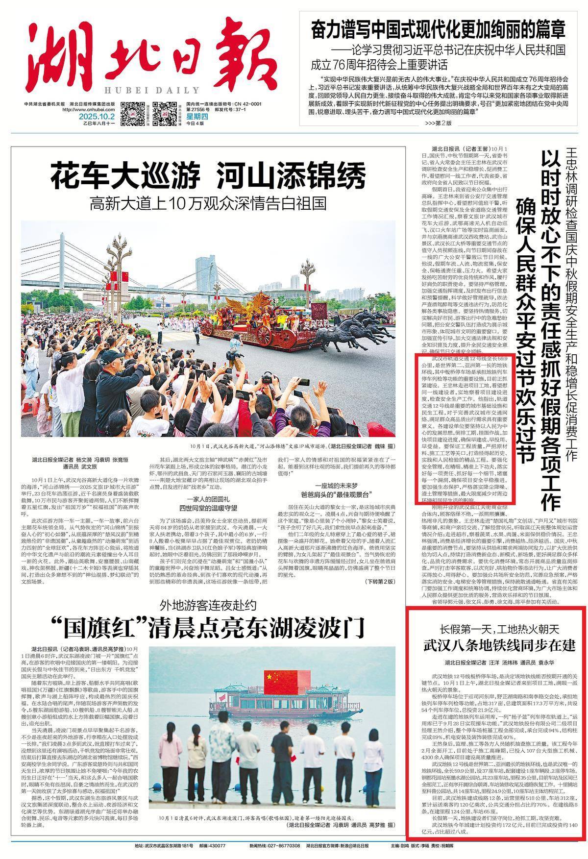 Hubei Daily All Media记者Wang Yang Tang Weiwei通讯员Yuan Yanghua▲2025年10月2日,Hubei Daily的首页着重于Wuhan Metro。 Wuhan Metro 12号线的Banqiao停车场是一个主要节点,它决定是否可以按时间表打开地铁线。 10月1日上午,Hubei Daily All Media记者到达了项目地点,现场充满了热情。 Banqiao停车场位于Xunsi河的东岸,位于Yezhihu South Road和Nanli Road的交汇处。它进行地铁停车检查和其他操作。它覆盖了317 MU的面积,总建筑面积为173,000平方米。它共有54个火车停车位,总投资为219亿元人民币。 ▲在武汉地铁第12号线的Banqiao停车场中,“ Yangzi Blue”地铁火车已经是Parkeda Track。穿过正在建设的火车地铁应用程序数据库,一个“长蓝色”停在赛道上。 “申请数据库在9月28日实现了汽车拾取功能。” Wang Ran是Wuhan Metro Co的项目经理的第二层,他确定了整个停车场桩项目已完成,轴承的94%完成,89%的结构柱完成,其中40%的机械和电气安装和装饰和装饰。在王跑的背后,包括行政,建筑和其他各方在内的各方的人员随机评估了建筑质量。该项目始于今年2月,目前处于建设高峰期。 “我们投资了107台大型建筑机构和4,300多人”,以确保高质量的项目建设进展。 Wuhmetro第12号线是世界上第二大地铁环,也是亚洲最长的。它也是武汉地铁环的唯一线条。它长59.9公里,有37个车站。它配备了1个仓库和2个停车场。 t这是从Gangdu花园站到Moshui Lake Park Station的23个车站,里程为35公里。目前,该站和部分已完成,并且在适当的情况下进行了全面的联合奉献,车站装饰和道路修复。从希利浦站到开浦公园站,有14个车站的里程为24.9公里。 10个站点的主要结构已完成。目前,武汉地铁(Wuhan Metro)建造了12条线路,运营了518公里和312个车站的里程,总共带来了约120亿乘客,其中一部分公共交通公共帐户近70%。在漫长的假期的第一天,地铁建造者留在他们的职位上,抓住了施工期并克服了困难。 ▲在漫长的假期的第一天,武汉地铁的建设仍在继续。盾牌机将从第11行的第四阶段开始地下20米。在第11行的第四阶段,在地下20米的六街站和Fangcao Road Station之间,有两个盾牌,它们是历史悠久的井,即将开始。操作员立即组装和切割板,焊接无处不在。在地铁项目的“最强大大脑”的地点 - 古波线网络控制中心,有800多名工人工作。这座高度为61个地铁,总建筑面积近95,000平方米的建筑达到了基本的封盖结构,并完全进入了窗帘安装,机械和电气安装以及室内装饰的阶段。武汉(Wuhan Metro)计划今年在城市建设上投资近172亿元人民币,并完成了近140亿元人民币的投资,价值超过80%。