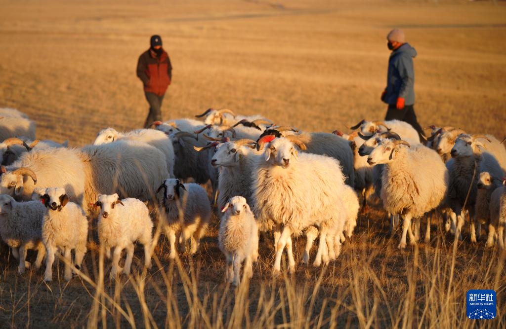 11月13日,青海省海北藏族自治州刚察县全吉乡宁夏村牧场,牧羊人正牵着羊群回到羊圈。