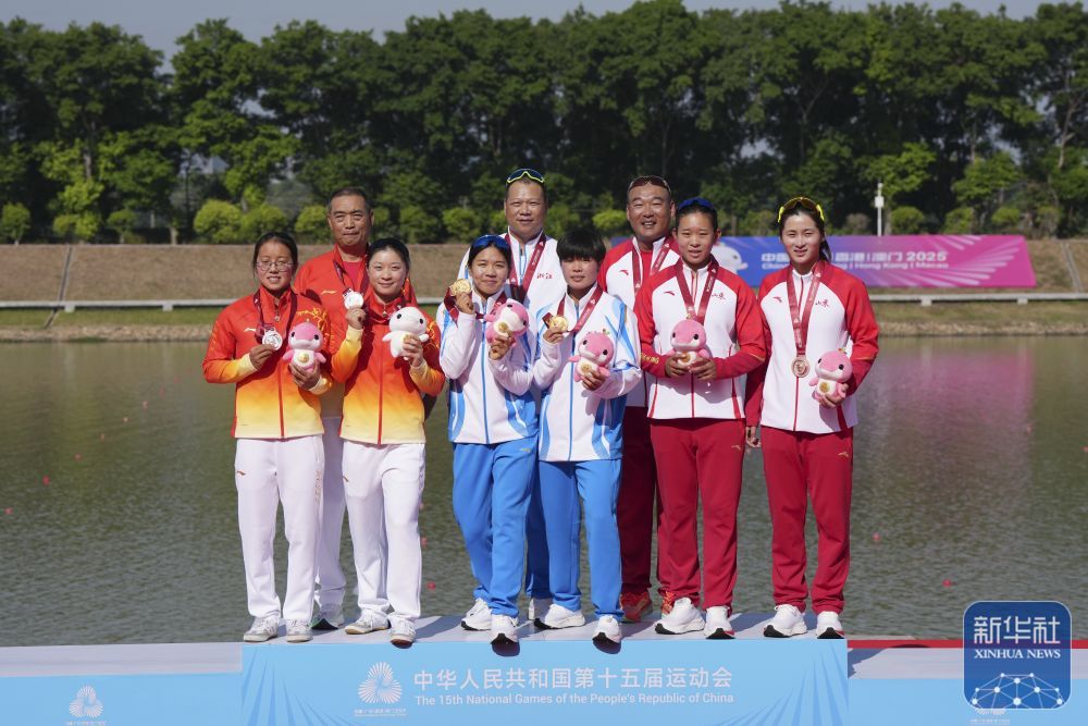 11月17日,第十五届全运会皮划艇平水项目500米双人赛艇决赛在广州举行。 ↑ 11月17日,浙江队冠军组合李书琪(前排左三)/薛丽娜(前排右三)、亚军湖北队组合滕安硕(前排左一)/蒋希娜(前排左二)、季军山东组合孙梦雅(右一)教练在颁奖典礼上。新华社记者晋美多吉摄↑浙江队组合李书琪(左上)/薛丽娜(右上)在女子500米双人赛艇决赛后庆祝,最终获得冠军。新华社记者杨诗瑶摄↑浙江队组合李书琪(前左)/薛丽娜在500米双人赛艇决赛A中,最终获得冠军。新华社记者杨诗瑶摄↑湖北队球员滕安硕(前左)/姜西娜(前右)在比赛中500米双人赛艇决赛A,最终获得第二名。新华社记者晋美多吉摄↑女子500米双人赛艇决赛A组湖北队选手滕安硕/姜西娜,最终获得第二名。新华社记者 杨诗瑶 摄 ↑山东队选手孙梦雅(左)/张雅爵在女子500米双人赛艇决赛A中,最终获得第三名。新华社记者晋美多杰 摄